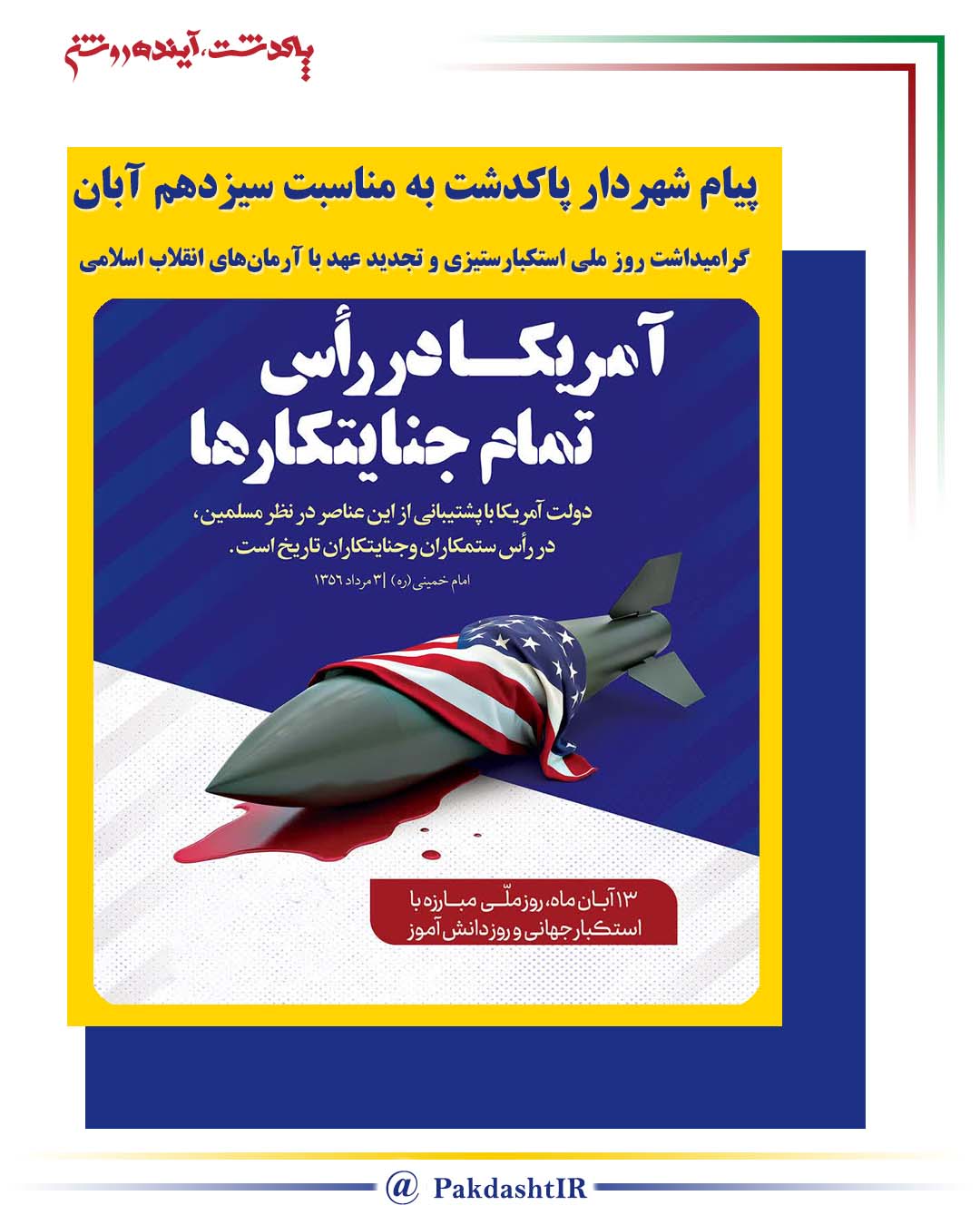 اینجانب به نمایندگی از مجموعه بزرگ مدیریت شهری پاکدشت و از باب «وَ ذَکِّرْهُمْ بِأَیَّامِ اللهِ» این روز بزرگ را گرامی میدارم و در طلیعۀ روز 13 آبان، با تأکید دوباره بر آرمانهای انقلاب اسلامی و درود بر ارواح شهدای انقلاب اسلامی، خداوند متعال را بهواسطه نعمت و امتنان به بندگان سپاسگزاری میکنم؛ خداوندی که مشیت و ارادۀ او اهل ایمان را امید بخشید و ستمگران را به هراس افکند.