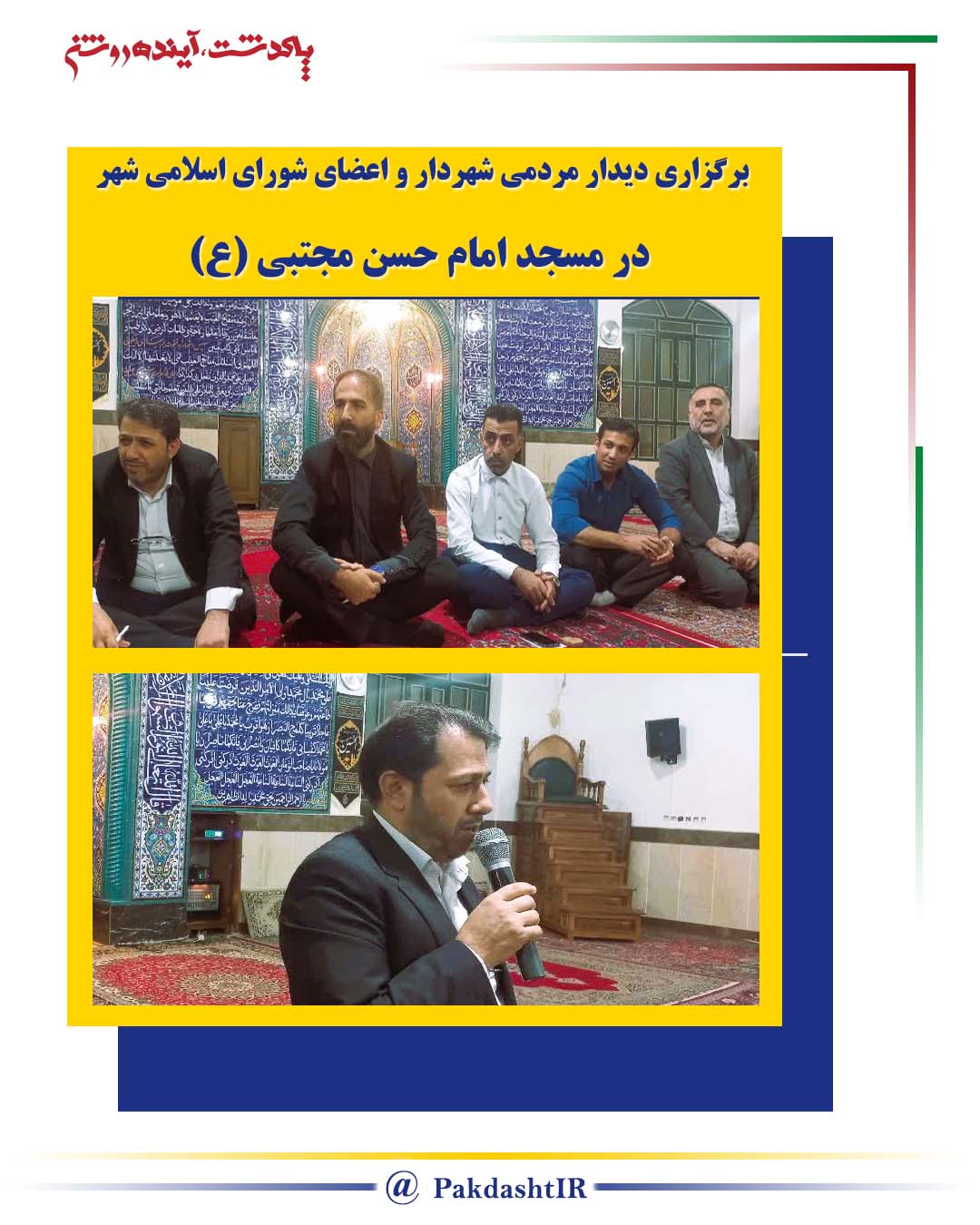 در راستای تداوم ارتباط چهرهبه چهره با شهروندان و رسیدگی مستقیم به درخواستهای مردمی، شکرزاده به همراه سعید اسدی رئیس ، احمد نجفی، صادق اسدی و حسین میری اعضای شورای اسلامی شهر ، با حضور در مسجد امام حسن مجتبی (ع) واقع در محله یبر، با شهروندان دیدار و گفتوگو کردند.